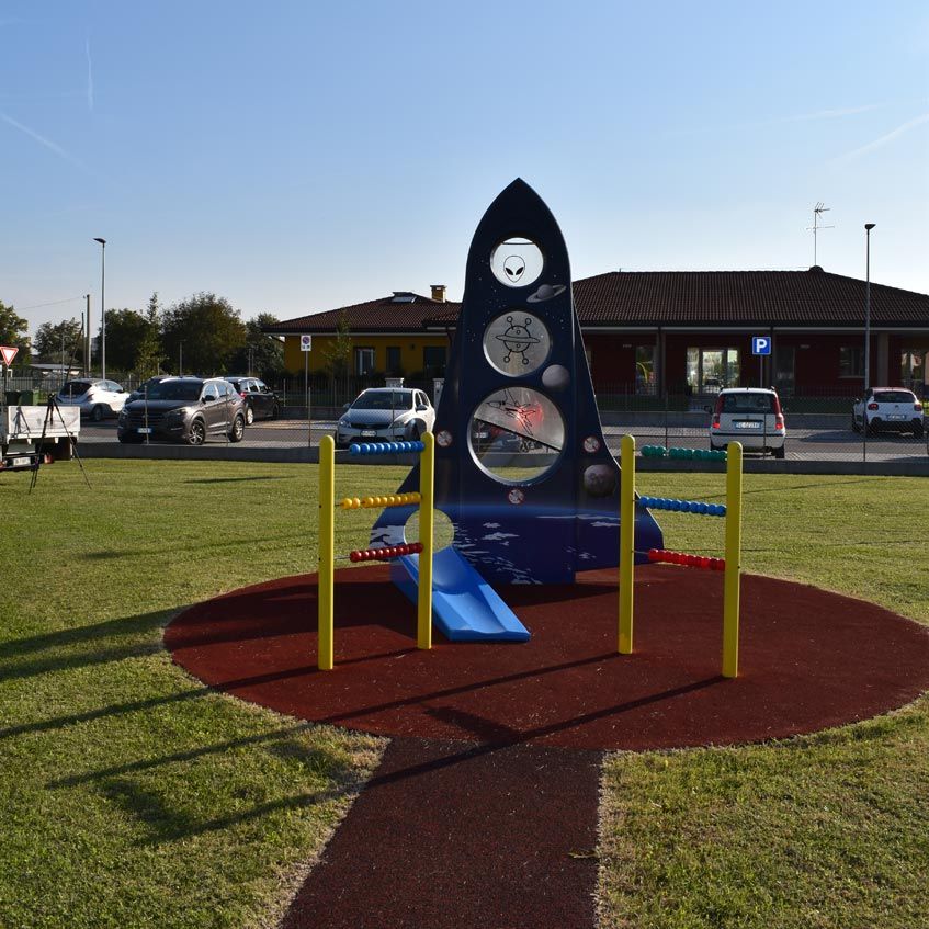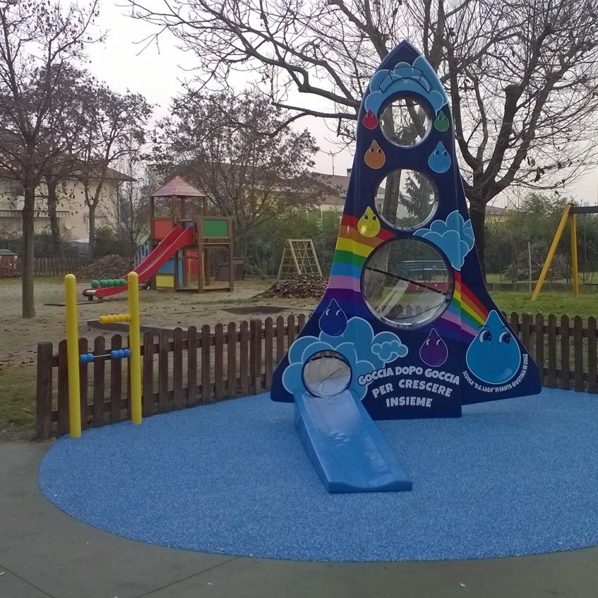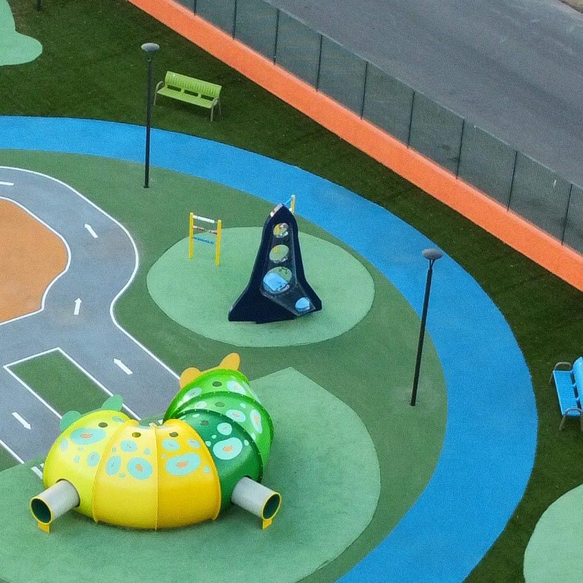 This activity consists of a fiberglass (VTR) structure fixed to the ground, featuring strategically sized and positioned openings in increasing difficulty, designed to be hit by a ball throw.