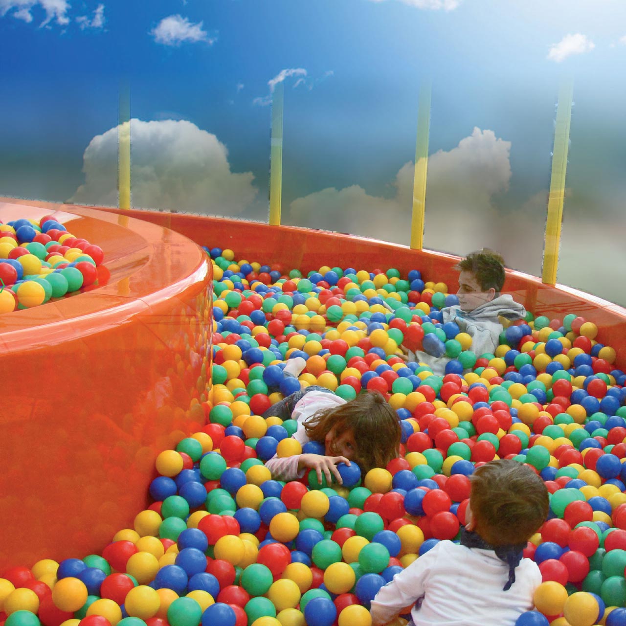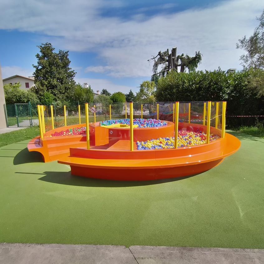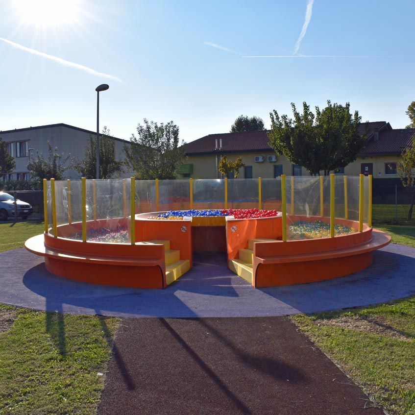 This activity consists of a circular modular fiberglass structure that creates two concentric ball pits. In the outer one, children can “immerse” themselves by accessing through the side ramps. The central area can be used while standing or by approaching with mobility aids. Access to the outer pit is via two small steps followed by specific sloping ramps. A transparent polycarbonate barrier surrounds the perimeter to contain the balls.