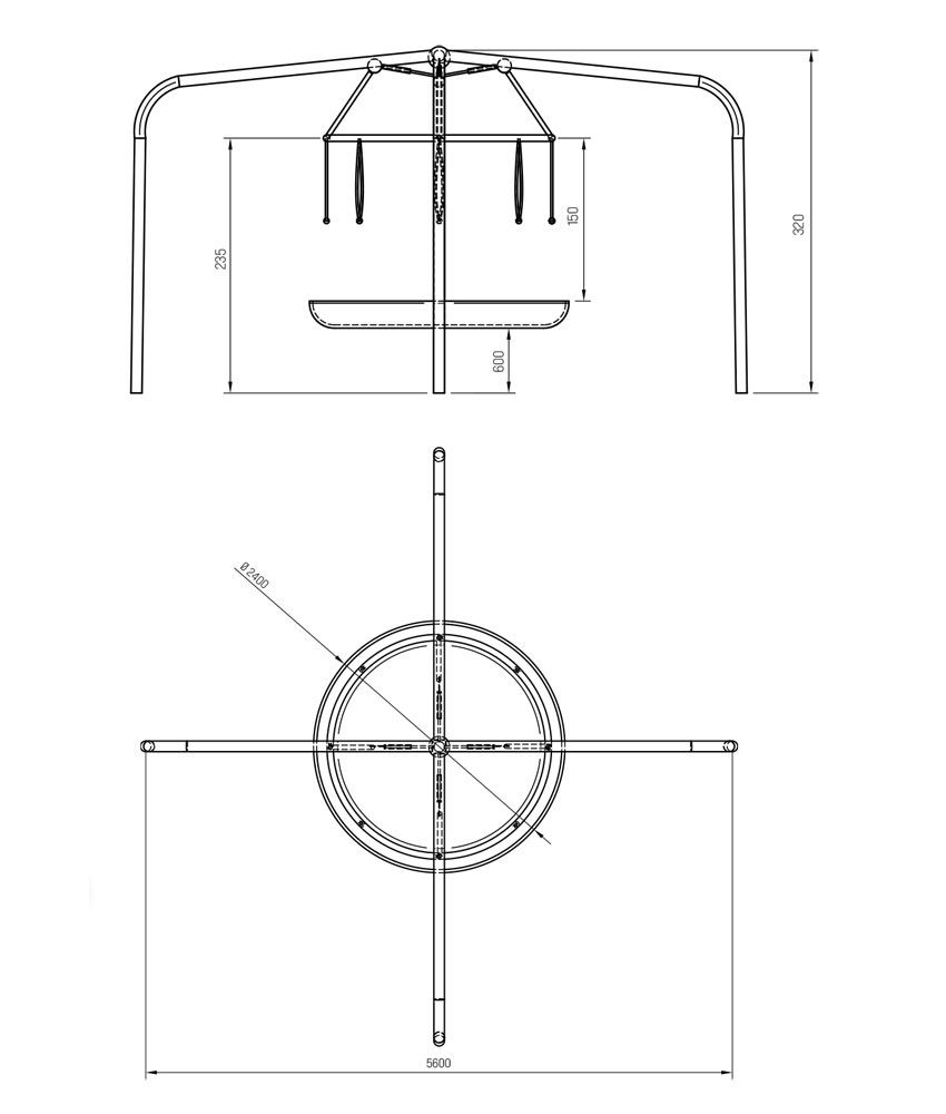 This activity features a central nest-shaped basin suspended from an arched support structure, allowing movement across the entire horizontal plane. Motion is regulated by a system of shock absorbers. The central nest is fully coated in resilient material, and children can swing independently using the suspended pushing ropes above them.
