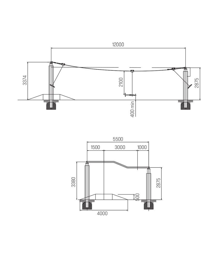 This activity is a reinterpretation of the zipline. It features two tracks: one with a sloped glide on a round seat with chain, the other with a horizontal translation on a supportive seat guided by a parent or caregiver.