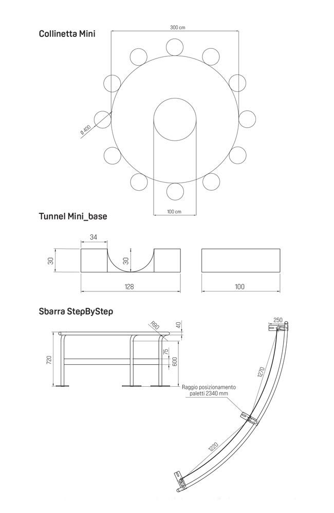 Tunnel with dimensions D60 and L 50 or 100 cm, made of a double layer of 1 cm thick EVA with a rigid polypropylene core. The tunnel is inserted into base/seating modules in high-density polyurethane foam covered in PVC.