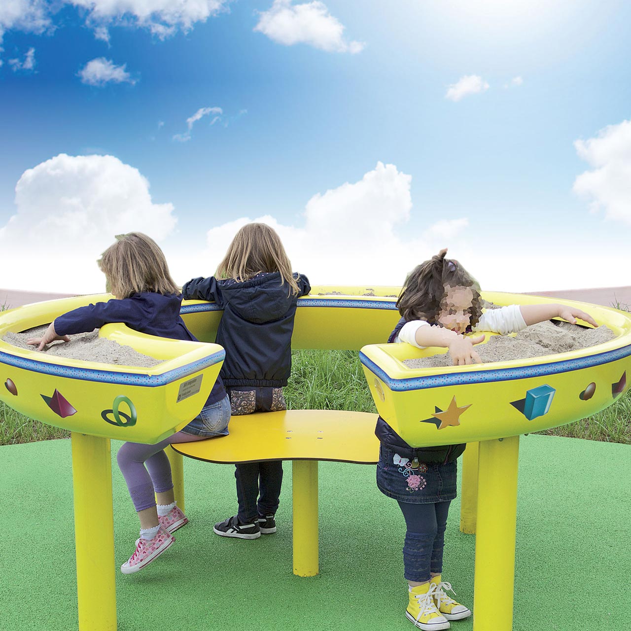 By approaching the structure from the outside or sitting inside, children can manipulate the sand and give shape to their ideas. In the ER version, with peripheral satellites, each child can find their moment to decide when to join the group play.