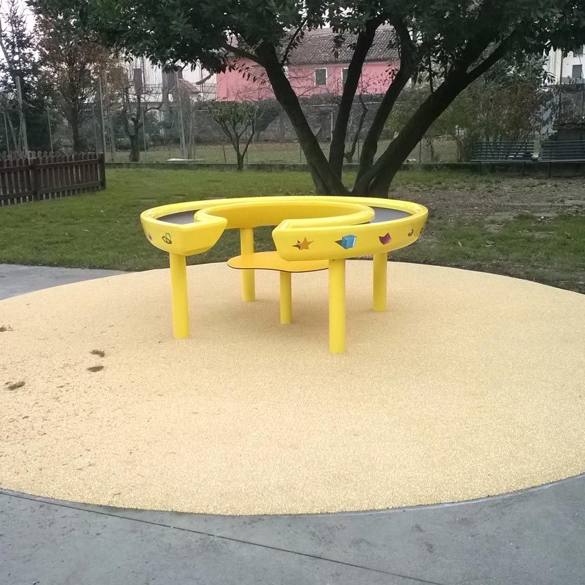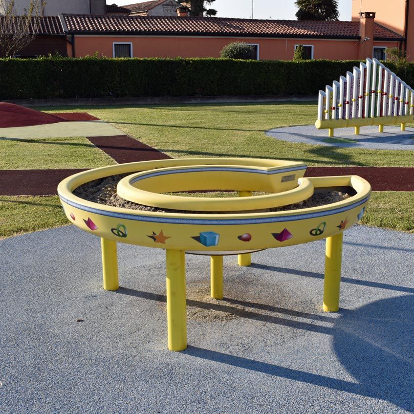 This activity also allows children with disabilities who use mobility aids to access and manipulate the sand. There are holes at the bottom that, through special filters, retain the sand while allowing rainwater to drain out. Children can play from the inside, sitting on the built-in bench, or from the outside, standing or approaching with mobility aids.