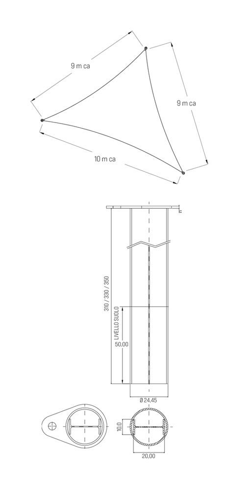 Load-bearing structure without cross bracing, made of reinforced tubular iron. Laser-cut shaped steel mounting plates. Hot-dip galvanizing and coating with non-toxic powder paint. The three columns of the module measure 260, 280, and 310 cm above ground level. Canopy made of flame-retardant, fiber-reinforced PVC mesh, with embedded galvanized strand rope tensioning and galvanized steel tips.