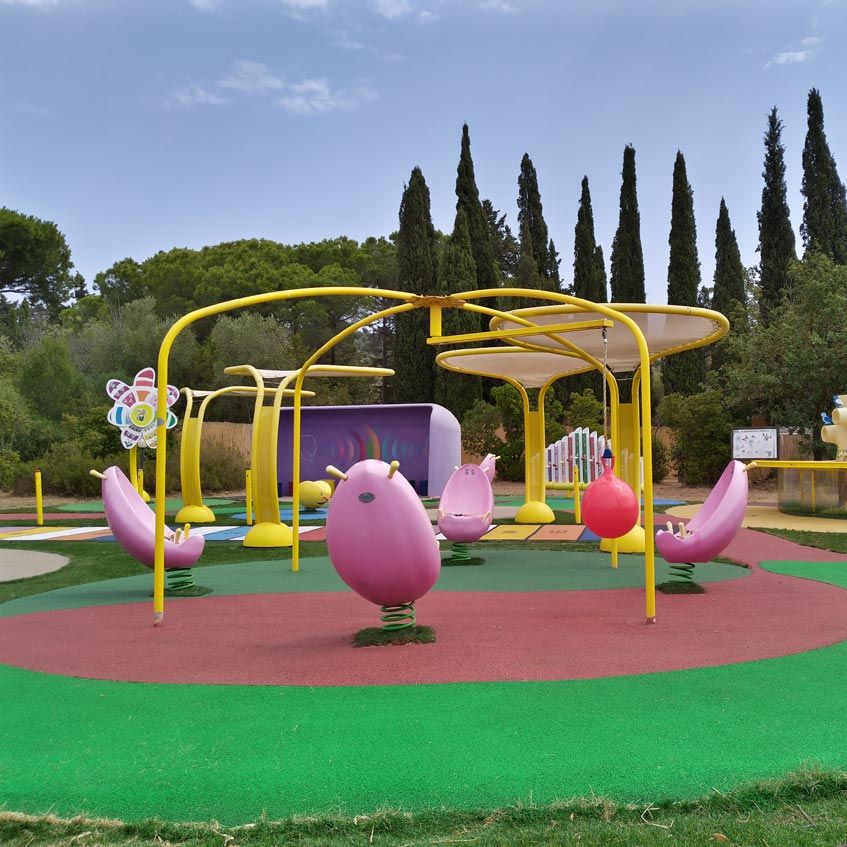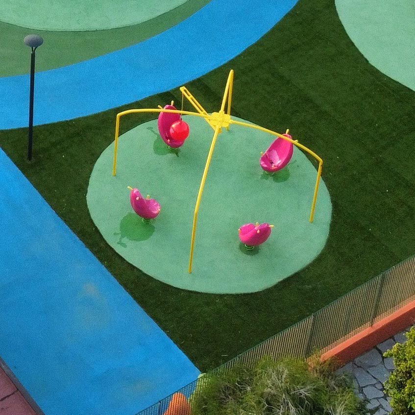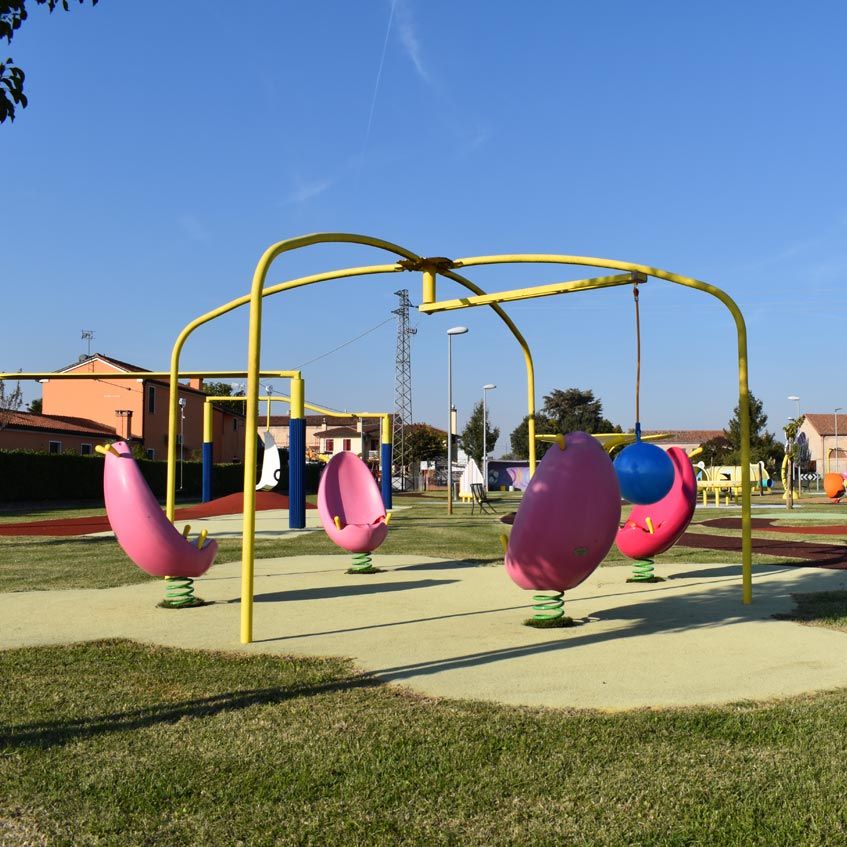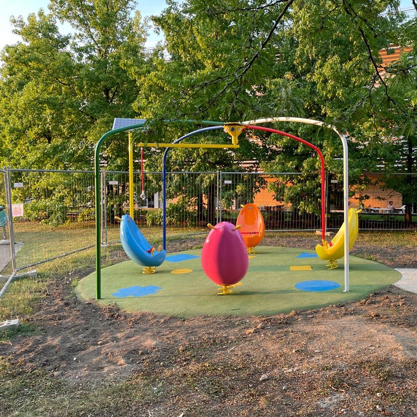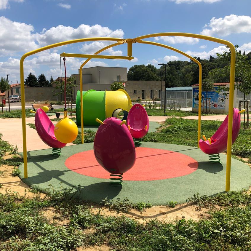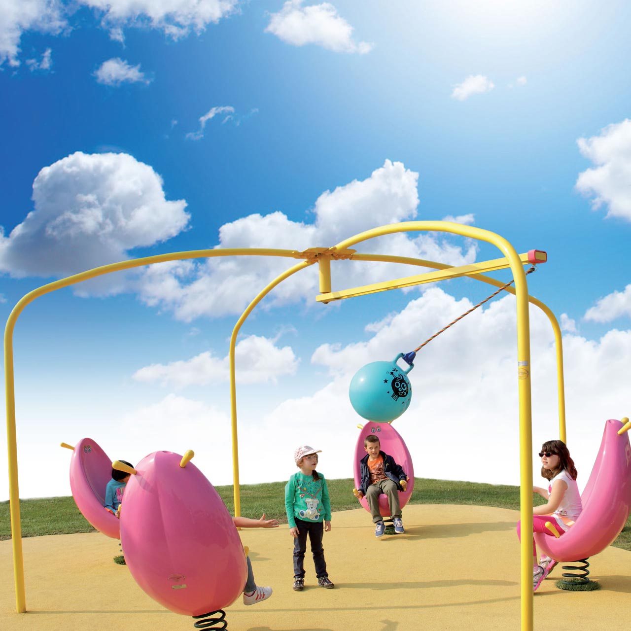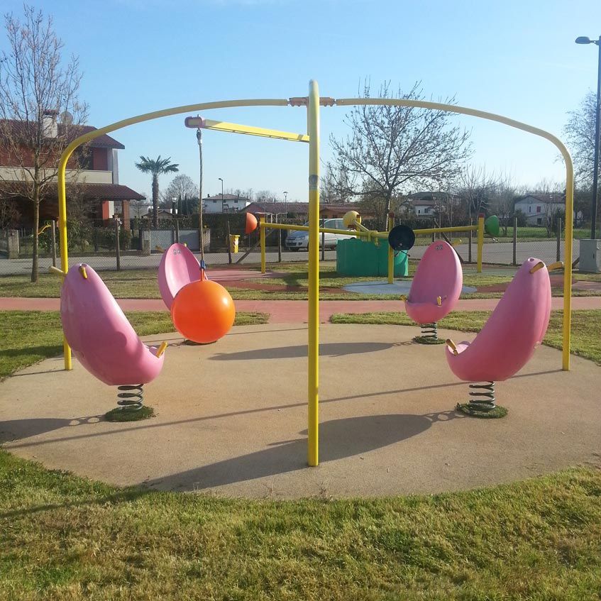 This activity consists of 4 spring-mounted wraparound seats and a metal structure designed to support the flying ball.