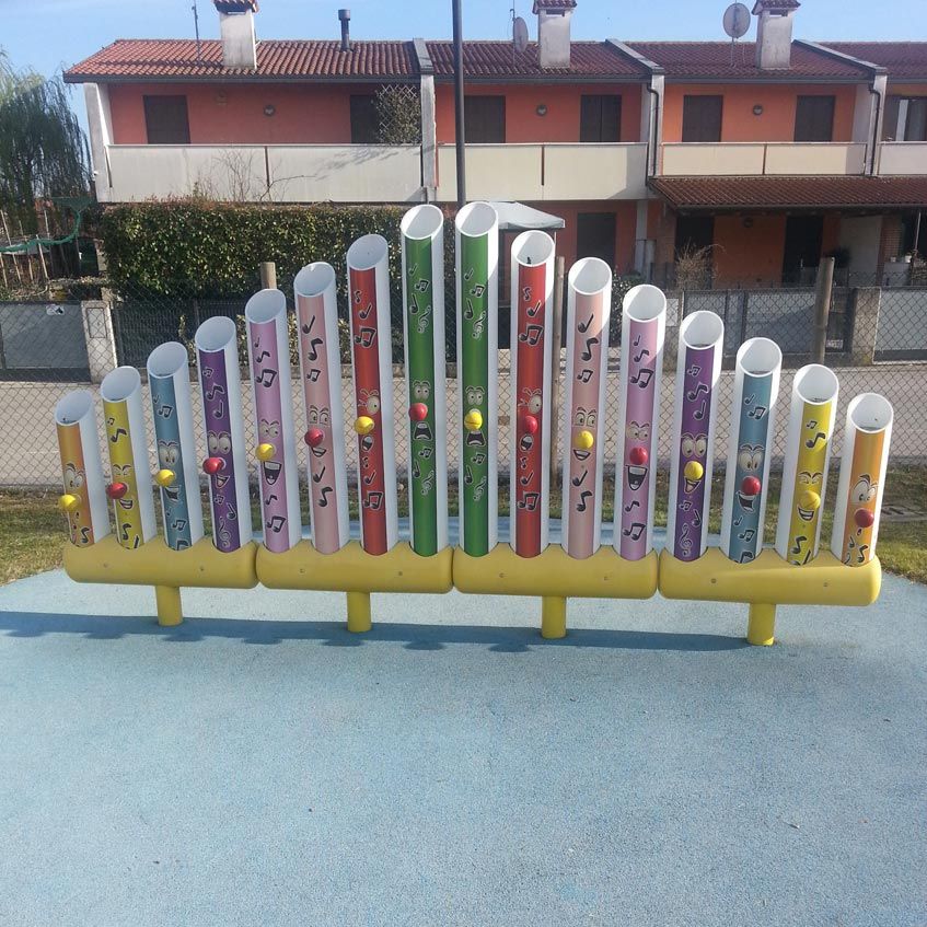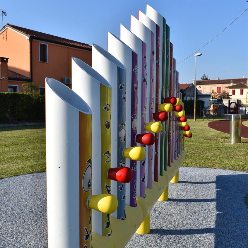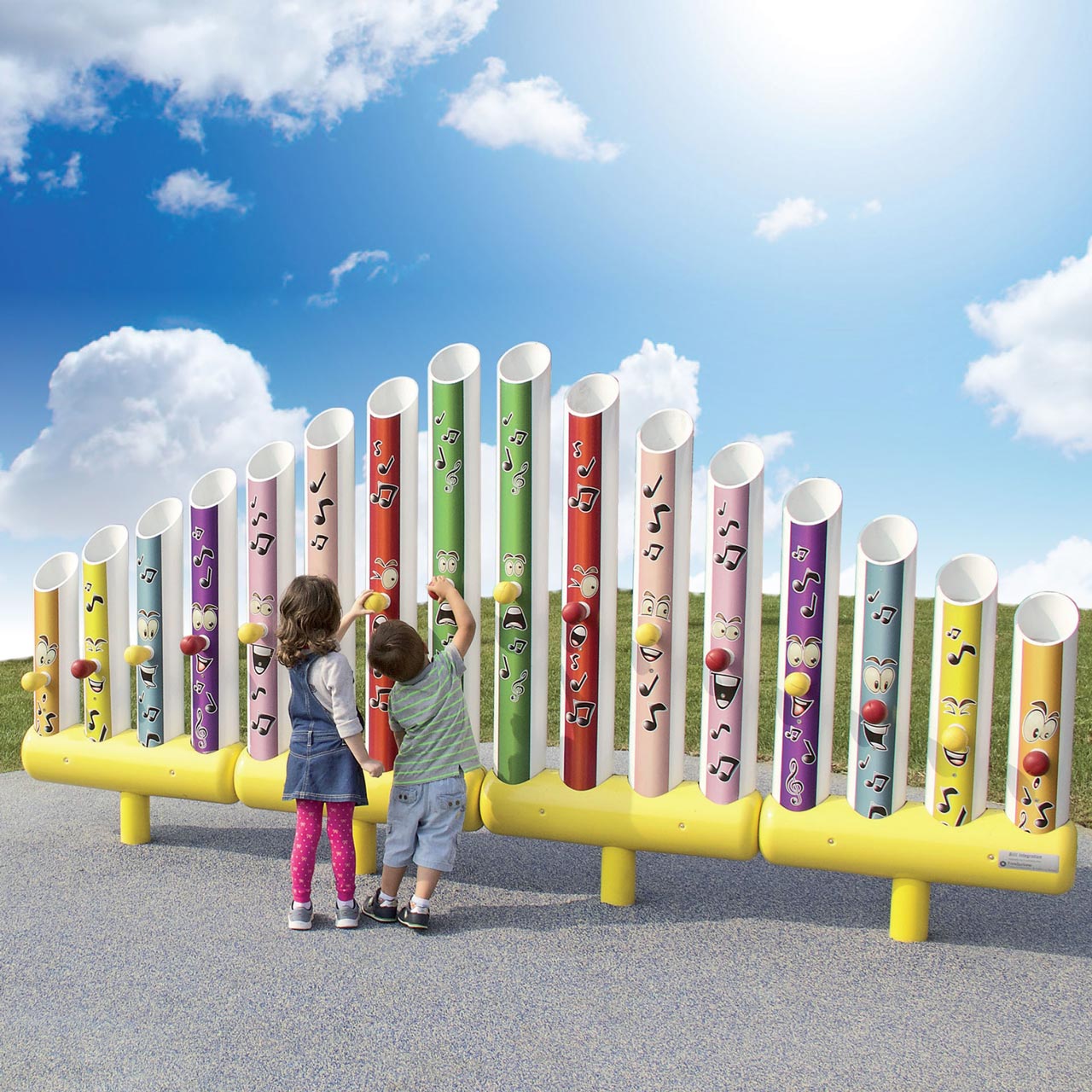 This activity brings the xylophone instrument into play. A double set of resonating tubes, with respectively inverted musical scales, can be played by pulling percussion “noses”, operating both in push and release.
