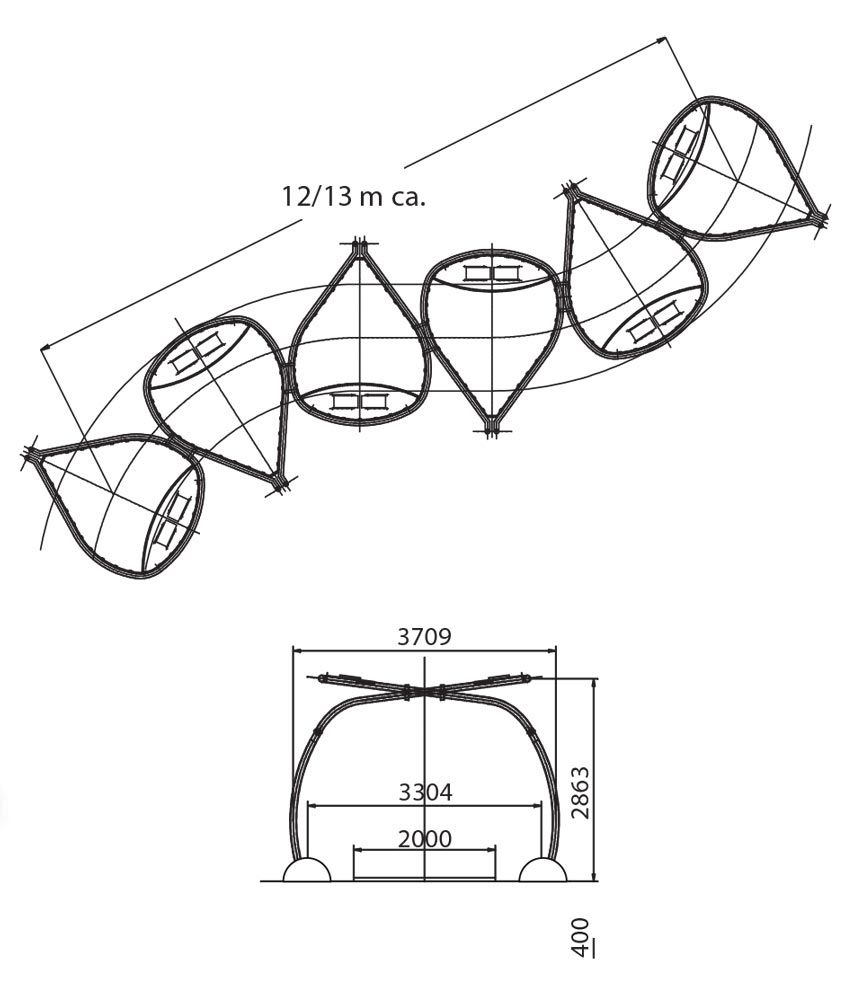 Entrata al parco con stimolazioni sonore e ottiche al passaggio. Completano la struttura petali ombreggianti dove sono posizionati i pannelli fotovoltaici.